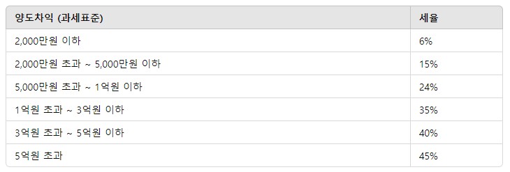 위 표에 나온 것처럼, 양도차익에 따라 6%에서 45%까지 차등적으로 세율이 적용됩니다.